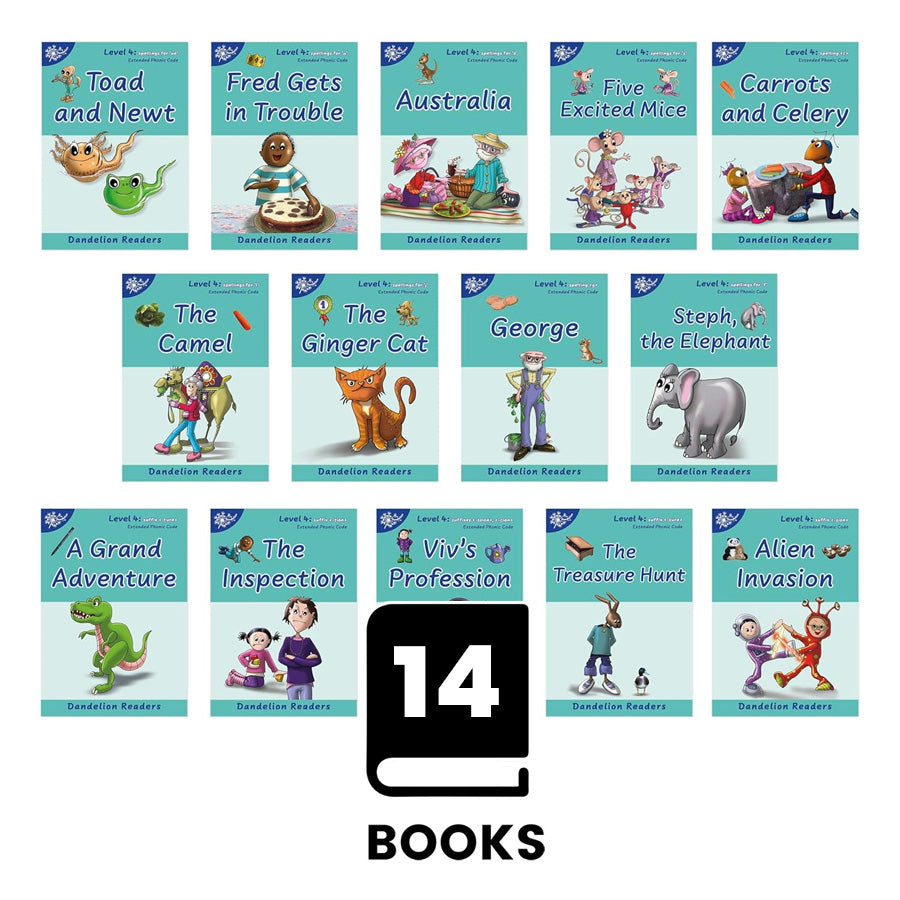 Level 4 ‘Toad and Newt’ consists of 14 different books introducing alternative spellings for vowels and consonants, alternative sounds for the spelling <c> and <g>, and common Latin suffixes.