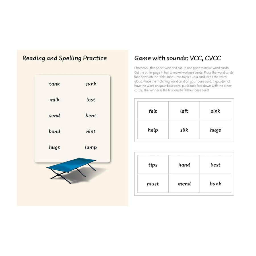 A workbook is also available. The book is photocopiable. The activities include word building, reading, spelling, comprehension, and more.