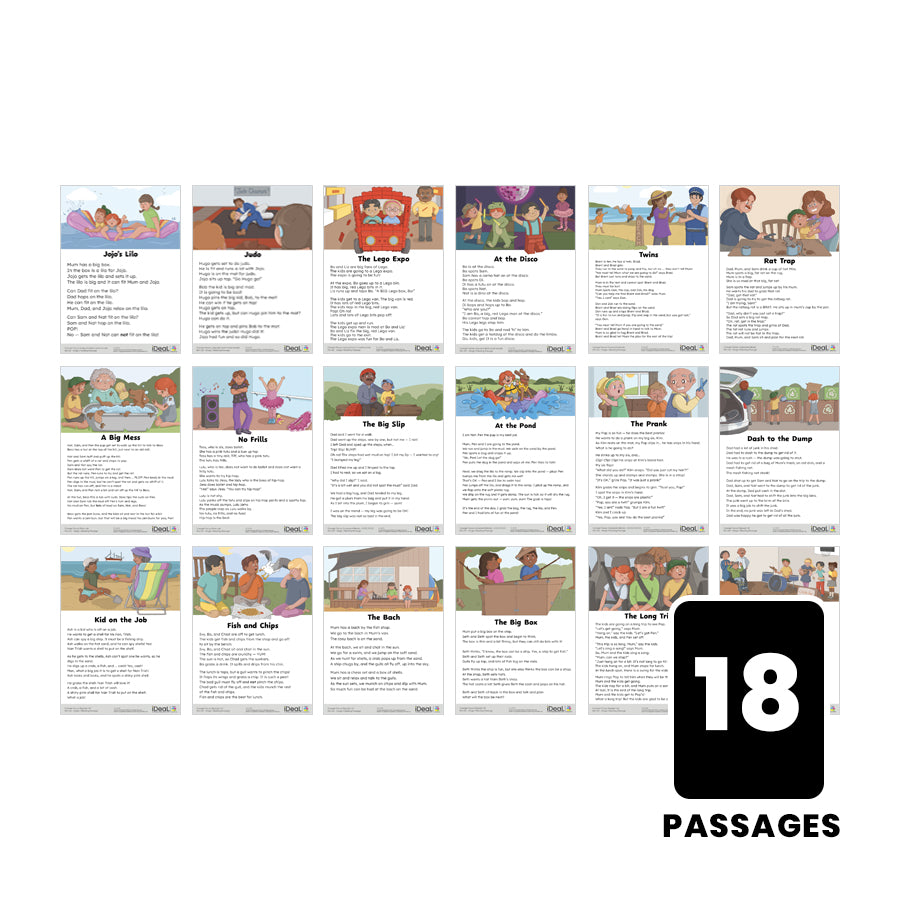 Set 2 consists of 18 different passages. This set includes passages for concepts 5-12 of the iDeaL Stage 1 Scope and Sequence.